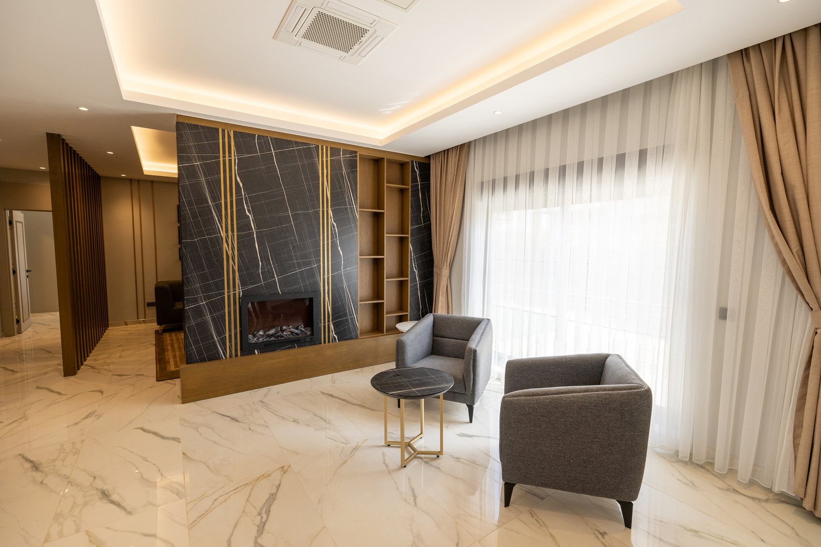 ✅ Yapay şömineli şık dinlenme alanı